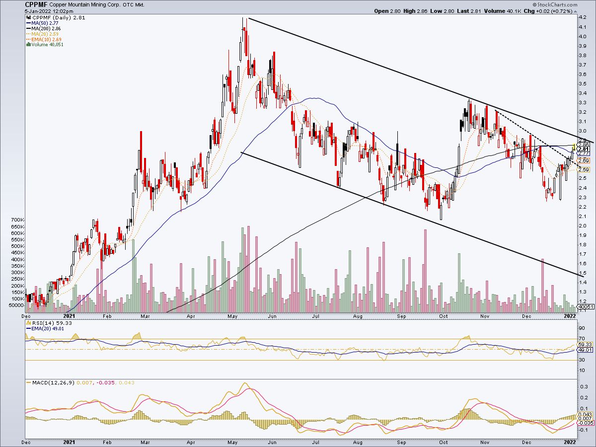 Today I added an individual miner to go along with COPX. CPPMF (CMMC.TO) is still dealing with its SMA 200 and a downtrend channel. Obviously, I like the look of COPX better and frankly, would more readily recommend that for a would-be copper bull than an individual situation like this. But CPPMF’s RSI has gone positive and MACD is triggered. As yet it’s more hunch than anything but an eventual take out of the moving averages and break of the channel could imply a new high.